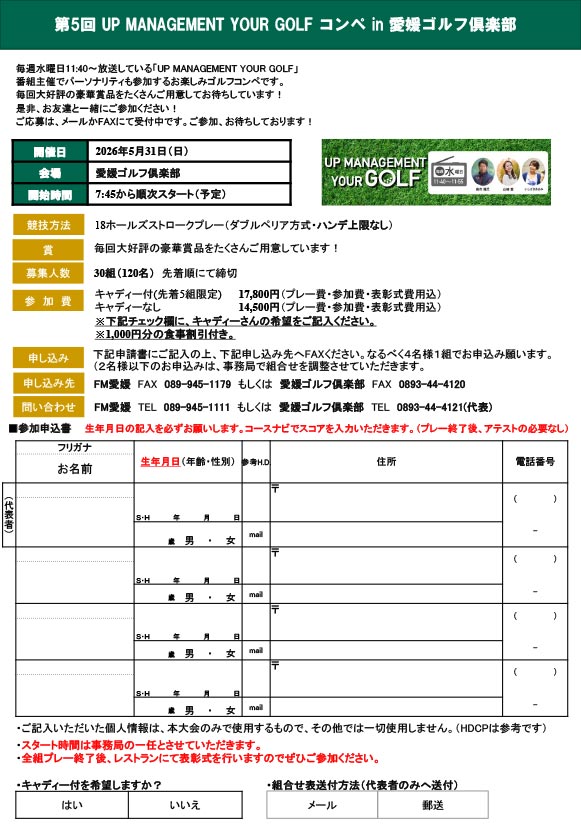 FM愛媛 FAX:089-933-6211 もしくは 愛媛ゴルフ倶楽部 FAX:0893-44-4120 まで送信してください。